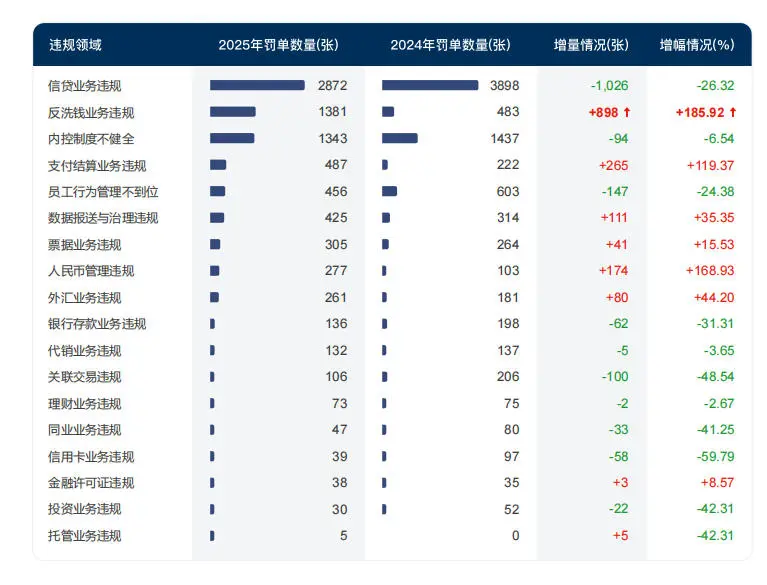 与2024年相比,2025年银行反洗钱业务违规罚单数量增量最为突出,达898张。反洗钱业务违规罚单数量增幅最大,达185.92%。
