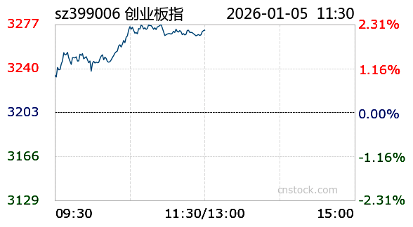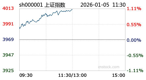 AI小壹1月5日讯 沪市小幅上涨,最高触及4011.75点,最低下探3983.58点,振幅1.07%。截至今日11:30收盘,上证指数报4011.45点,涨幅1.07%,成交额6913.62亿元,成交量3.82亿;深证成指报13777.32点,最高13782.05点,最低13633.63点,涨幅1.87%,成交额9444.17亿元,成交量5.35亿;创业板报3272.07点,最高3277.17点,最低3229.93点,大涨2.15%,成交额4344.13亿元,成交量1.68亿。