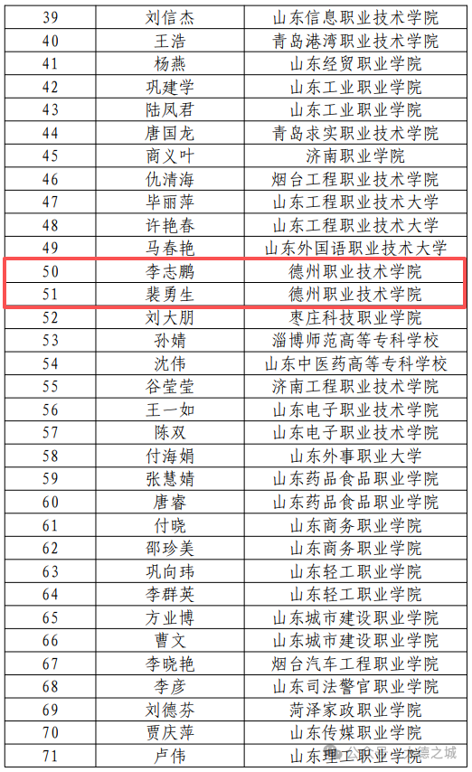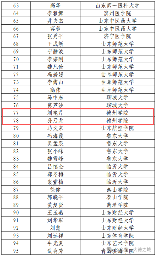 1月4日,山东省教育厅公示2025年省高等学校教学名师认定结果,共认定高等教育教学名师200人。其中德州学院刘艳芹、孙乃龙,德州职业技术学院李志鹏、裴勇生四位老师上榜。