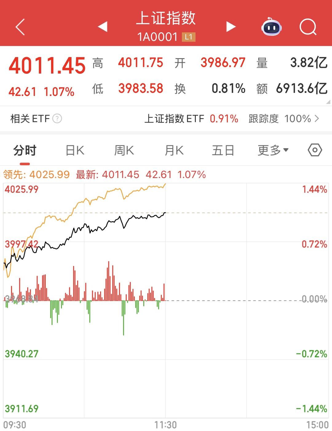 1月5日,2026年首个交易日,A股迎来开门红。三大股指分别高开0.46%、0.80%、0.84%,盘中指数不断攀升,10:21,沪指重回4000点上方,截至午间收盘,沪指涨1.07%,报4011.45点,深证成指、创业板指分别涨1.87%、2.15%。全市4070只个股上涨,半日成交额1.65万亿元,较上日增3240亿元。