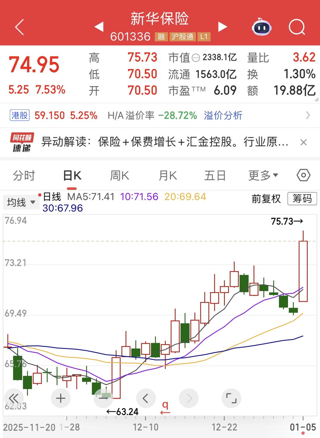 分板块来看,保险股集体爆发,板块盘中涨幅一度接近6%,新华保险、中国太保双双续创历史新高,前者触及75.73元/股,后者触及44.67元/股。