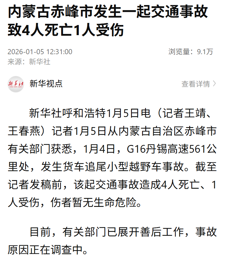 记者1月5日从内蒙古自治区赤峰市有关部门获悉,1月4日,G16丹锡高速561公里处,发生货车追尾小型越野车事故。截至记者发稿前,该起交通事故造成4人死亡、1人受伤,伤者暂无生命危险。目前,有关部门已展开善后工作,事故原因正在调查中。(新华社)
