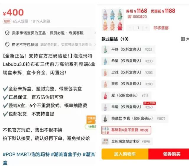 1月5日,界面新闻从二手交易平台获悉,部分LABUBU 3.0前方高能系列整端6盒的转手价为400元,远低于官方价。同日,LABUBU天猫旗舰店的同款6盒不重复的价格为1168元,整端塑封未拆的价格为1198元。