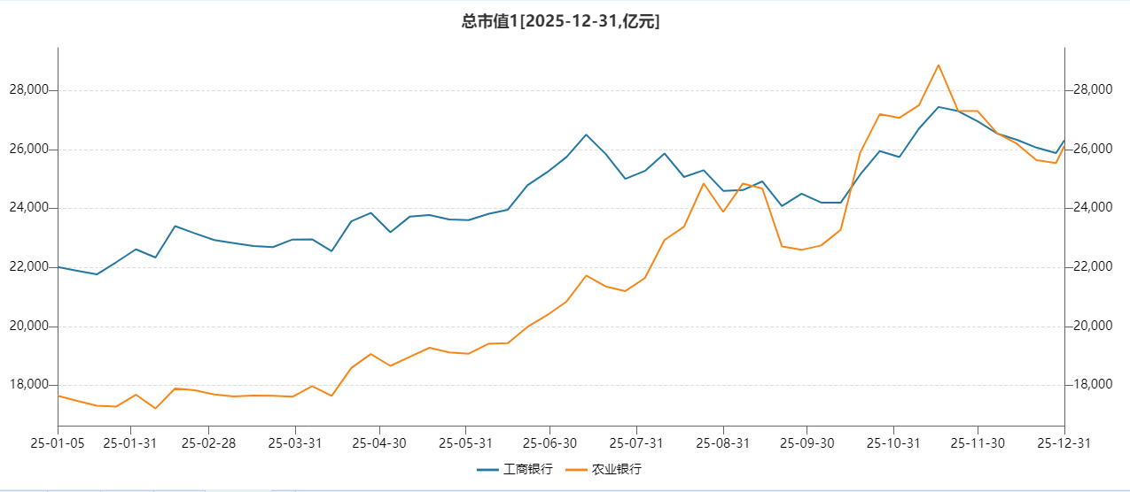 2025年9月4日,农行总市值触及2.55万亿元,历史性地超越“宇宙第一大行”工商银行,一度登上A股市值冠军宝座。截至2025年12月31日收盘,工行仍旧以2.63万亿元位居总市值榜首,农行以2.61万亿元紧随其后。