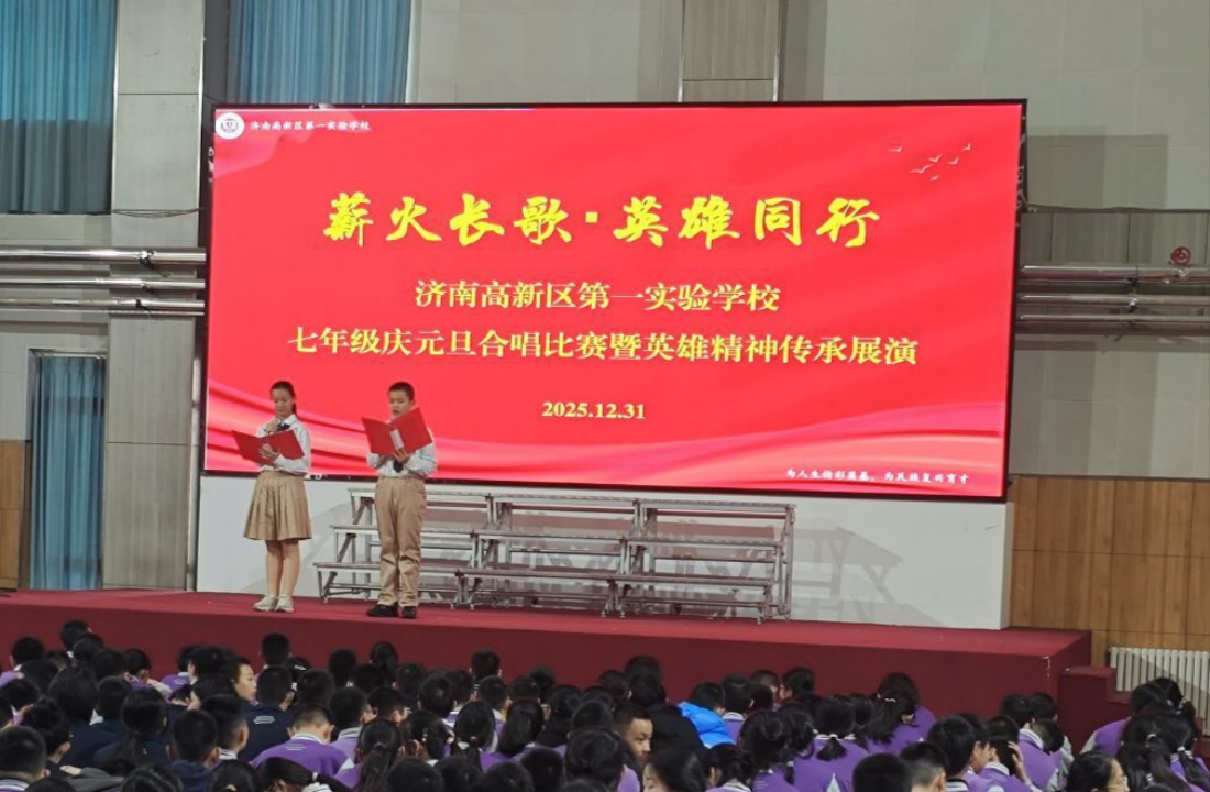 冬日暖阳融霜雪,青春歌声颂华章。2025年12月31日,济南高新区第一实验学校体育馆内掌声雷动、暖意融融,七年级“薪火长歌·英雄同行”庆祝元旦合唱比赛暨英雄精神传承活动顺利举行。全体七年级师生齐聚一堂,以嘹亮歌声传承英雄精神,以青春姿态致敬时代光辉,共同迎接崭新一年的到来。