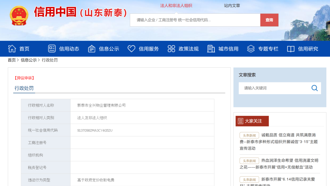 近日,信用中国(山东新泰)网站发布一则行政处罚,详情如下: