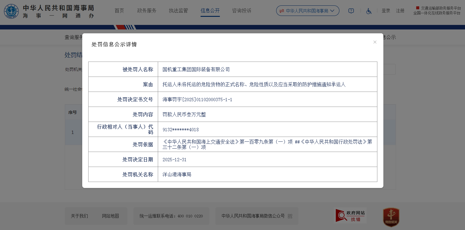 齐鲁晚报·齐鲁壹点记者于中国海事局监管信息公开栏获悉,2025年12月31日,国机重工集团国际装备有限公司(下称“国机重工国际公司”)收洋山港海事局罚单,处罚决定书文号:海事罚字[2025]01102000375-1-1。