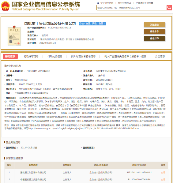 国家企业信用信息公示系统显示,国机重工集团国际装备有限公司成立于2012年,注册资本10000万元人民币,法定代表人为王传明,大股东为中国国机重工集团有限公司。