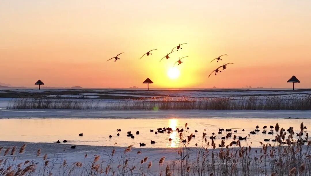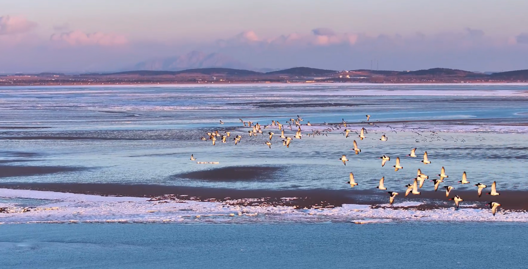 香水河里,成群水鸟栖息水面、低飞徘徊;五垒岛湾上,翘鼻麻鸭振翅翱翔,划过澄澈晴空,它们黑白相间的羽色,在蓝天碧水的映衬下格外醒目,与蔚蓝大海共同绘就独具韵味的冬日生态图景。