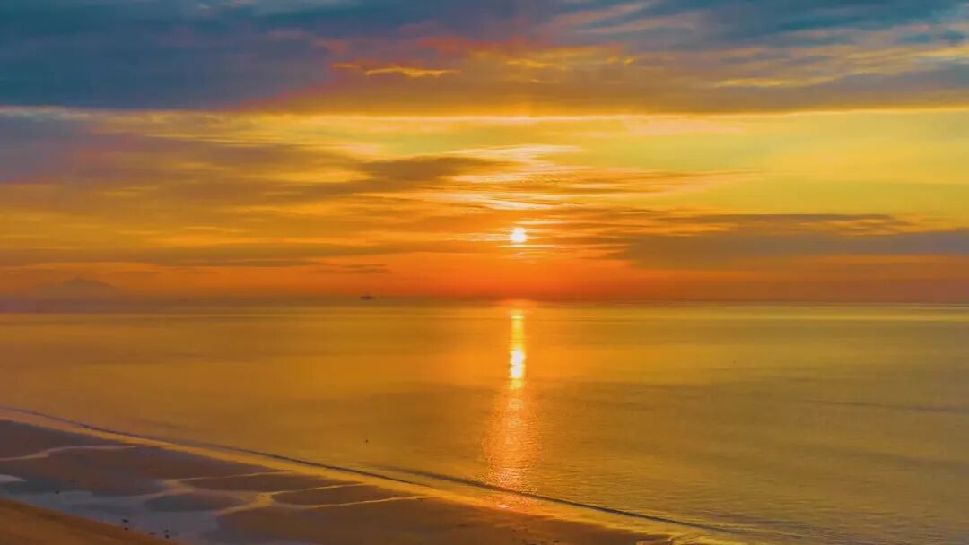 在南海公园、观海公园,天未亮便守在沙滩,看深蓝天幕渐染橙粉霞光,朝阳刺破云层、跃出海平面的瞬间,鎏金光芒洒满海面。浪花携着晨光轻涌上岸,将雪色沙滩镀上一层暖边。