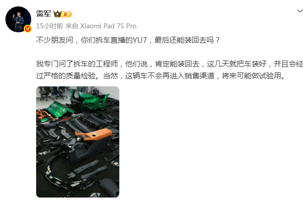 雷军称:不少朋友问,你们拆车直播的YU7,最后还能装回去吗?我专门问了拆车的工程师,他们说,肯定能装回去,这几天就把车装好,并且会经过严格的质量检验。当然,这辆车不会再进入销售渠道,将来可能做试验用。