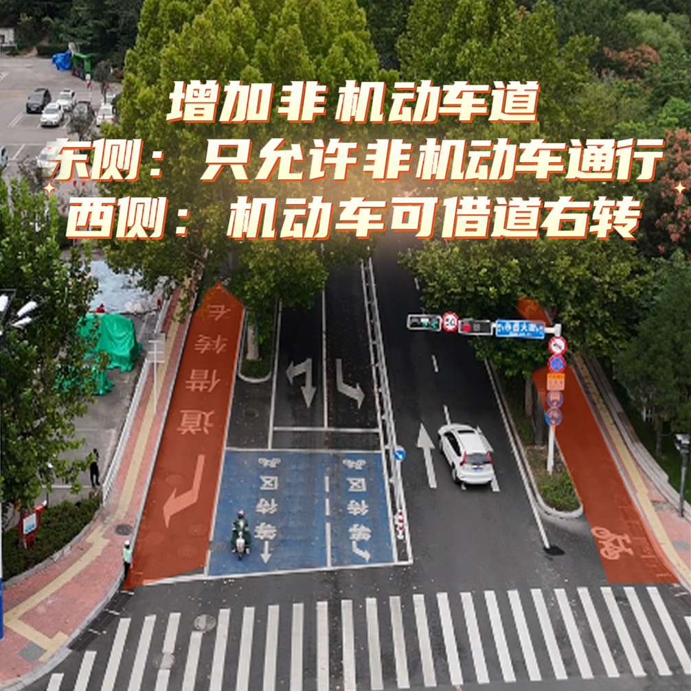 迎春路增设非机动车道,西侧非机动车道由北向西进入东岳大街的机动车可借此道右转,并设置非机动车等待区。实现了机非分离,提升了机动车右转效率。