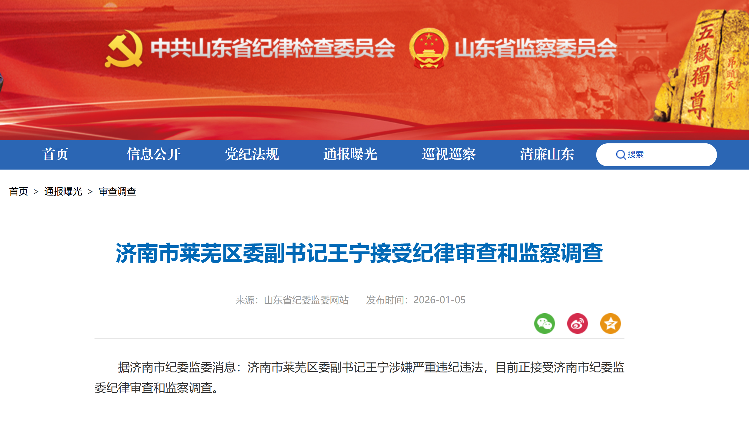 山东省纪委监委网站1月5日消息,济南市莱芜区委副书记王宁涉嫌严重违纪违法,目前正接受济南市纪委监委纪律审查和监察调查。
