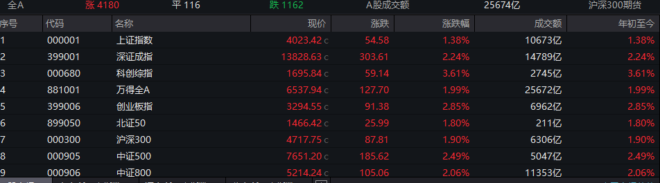 今日,创业板指领涨,沪指时隔34个交易日重回4000点,录得十二连阳,创1993年以来最长连阳纪录。沪深两市成交额高达2.55万亿元,较上一个交易日放量5011亿元。截至收盘,沪指涨1.38%,深成指涨2.24%,创业板指涨2.85%。科创综指涨3.61%。