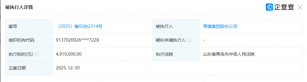 1月5日,企查查最新信息显示,青建集团股份公司新增两条被执行人信息,执行法院均为青岛市中级人民法院。其中一条执行标的491万元,案号为(2025)鲁02执2314号;另外一条执行标的464万元,案号为(2025)鲁02执2315号。