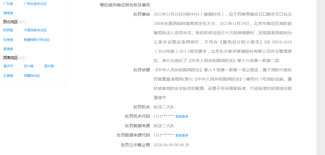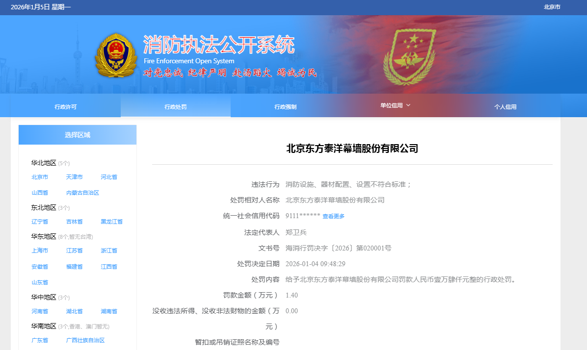 齐鲁晚报·齐鲁壹点记者于消防执法公开系统获悉,1月4日,北京东方泰洋幕墙股份有限公司(下称“泰洋幕墙”)收罚单,其违法行为是“消防设施、器材配置、设置不符合标准”。