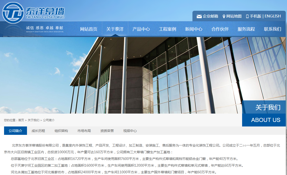 据泰洋幕墙官网介绍,公司是集室内外装饰工程、产品开发、工程设计、加工制造、安装施工、售后服务为一体的专业化装饰工程公司。公司年产量可达160万平方米,拥有三大幕墙门窗生产加工基地。,近年来先后承接了中国工商银行总行营运办公楼、中国兵器装备研究院、赤几马拉博展览中心、阿联酋迪拜轻轨、越南河内轻轨等项目。