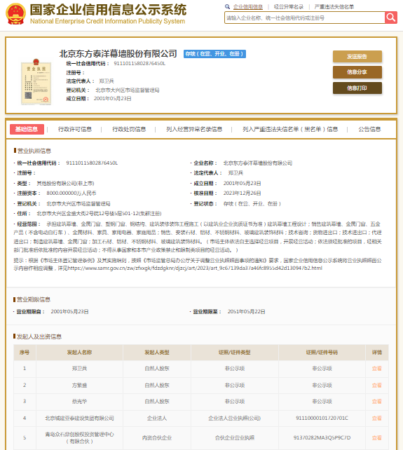 国家企业信用信息公示系统显示,北京东方泰洋幕墙股份有限公司成立于2001年,注册资本8000万元人民币,法定代表人郑卫兵。