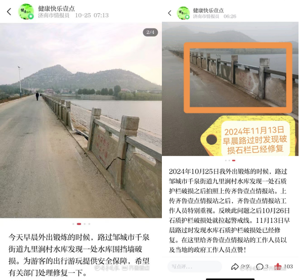 济宁情报员“健康快乐壹点”通过齐鲁壹点情报站反映,济宁邹城九里涧水库一处石质护栏破损存安全隐患,几天后情报员发现水库石质护栏破损处已经修复。