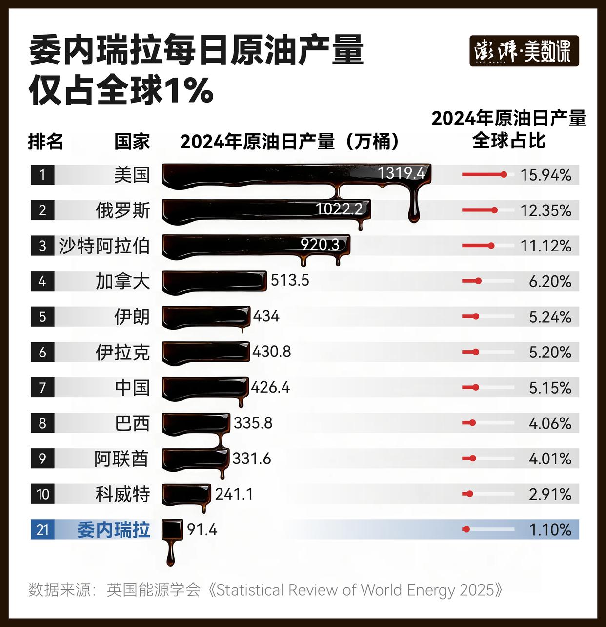与储量形成鲜明对比的是委内瑞拉的原油产量。英国能源学会(EI)在2025年发表的能源行业研究报告指出,委内瑞拉2024年每日原油产量约为91.4万桶,仅占到全球原油日产量的1.1%。对比来看,美国的每日原油产量约为委内瑞拉的14倍。