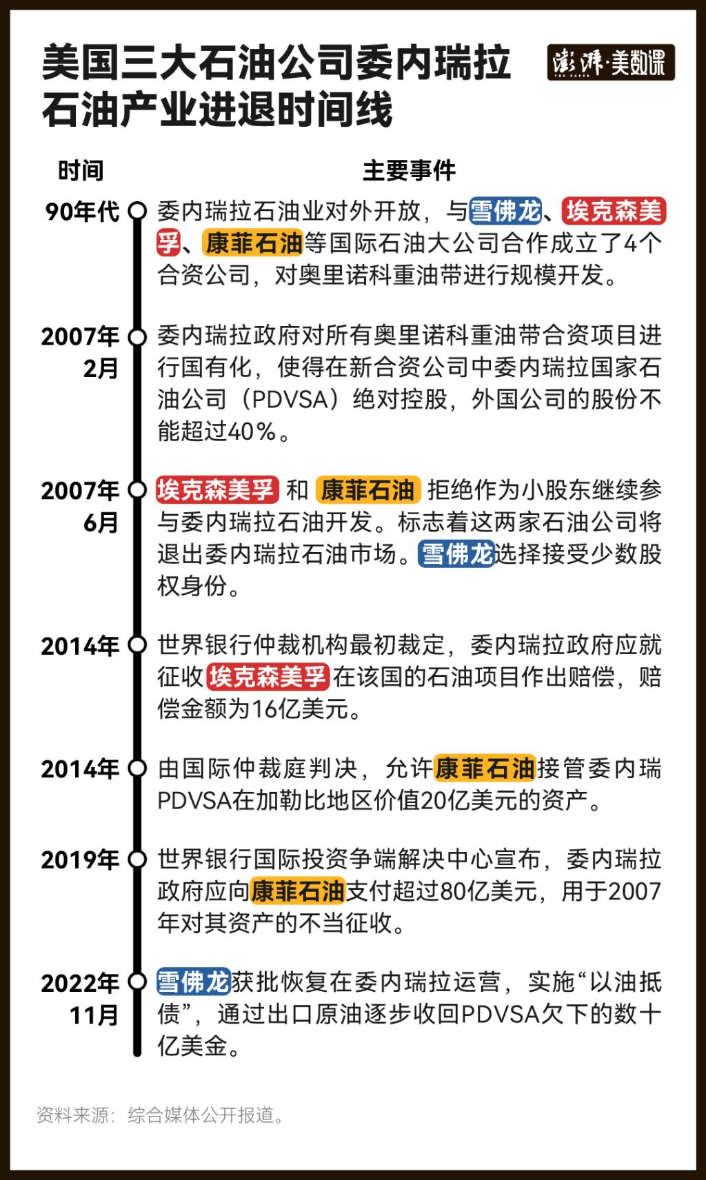 上世纪90年代,包括雪佛龙、埃克森美孚、康菲石油在内的美国石油公司曾参与委内瑞拉奥里诺科重油带项目的联合开发。2007年,由于委内瑞拉政府对所有奥里诺科重油带合资项目实行国有化,三家美国石油公司中只有雪佛龙接受了股权重组方案,埃克森美孚、康菲石油在撤出委内瑞拉后,资产被委内瑞拉政府收归国有,陷入与委内瑞拉政府长达数年的国际仲裁。