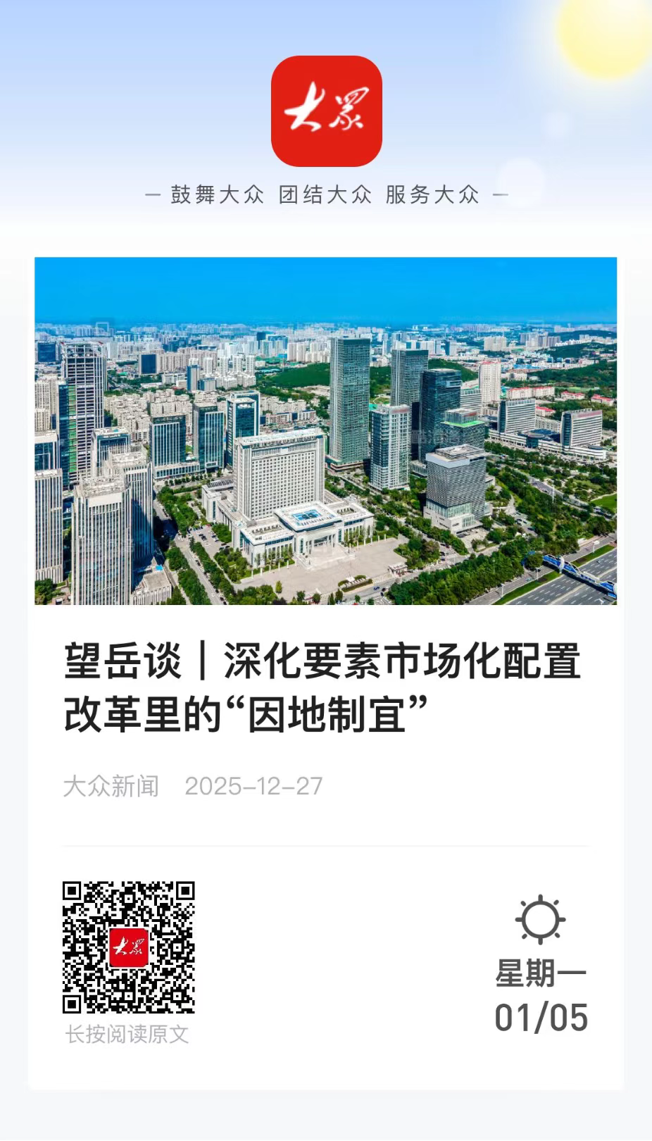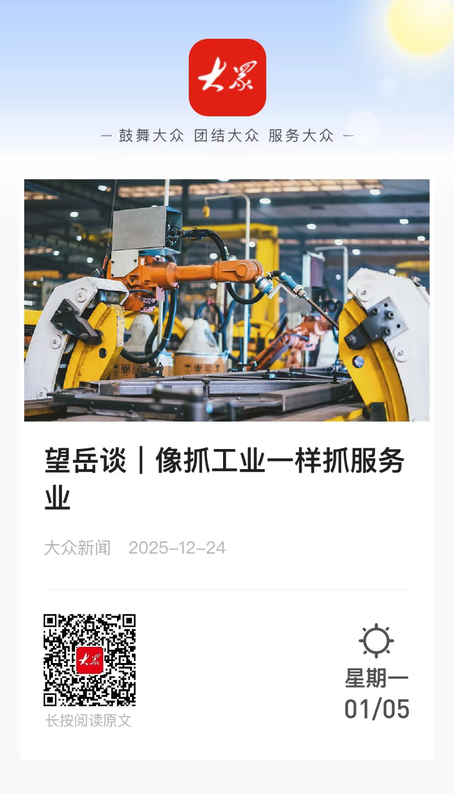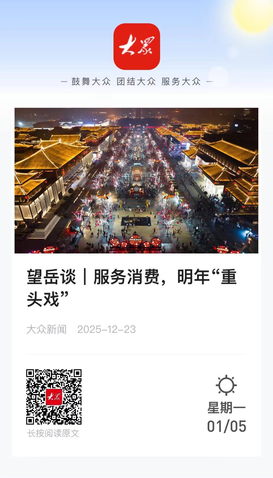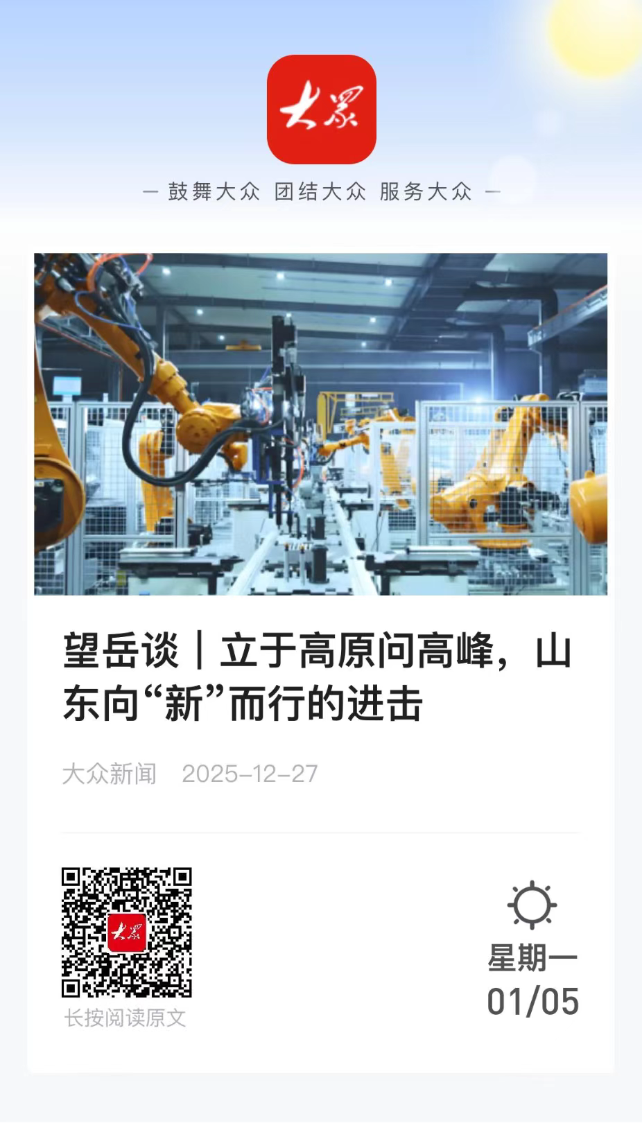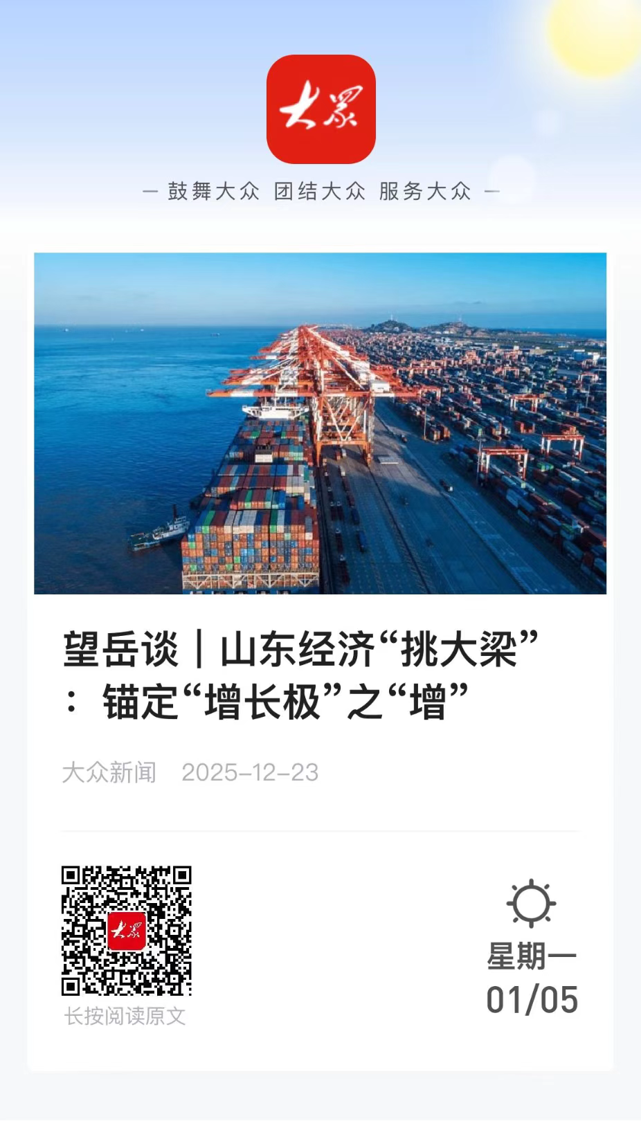 为深度解析山东省委经济工作会议精神,大众新闻推出“望岳谈”系列网评六篇,紧扣服务业提质、增长极打造、服务消费扩容、要素改革深化、新质生产力培育和“人工智能+制造”融合等关键议题,系统阐释山东推动高质量发展路径。