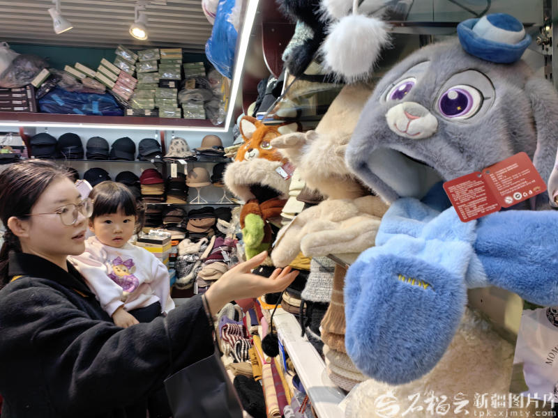 1月5日,市民在乌鲁木齐市华凌贸易城选购卡通帽。