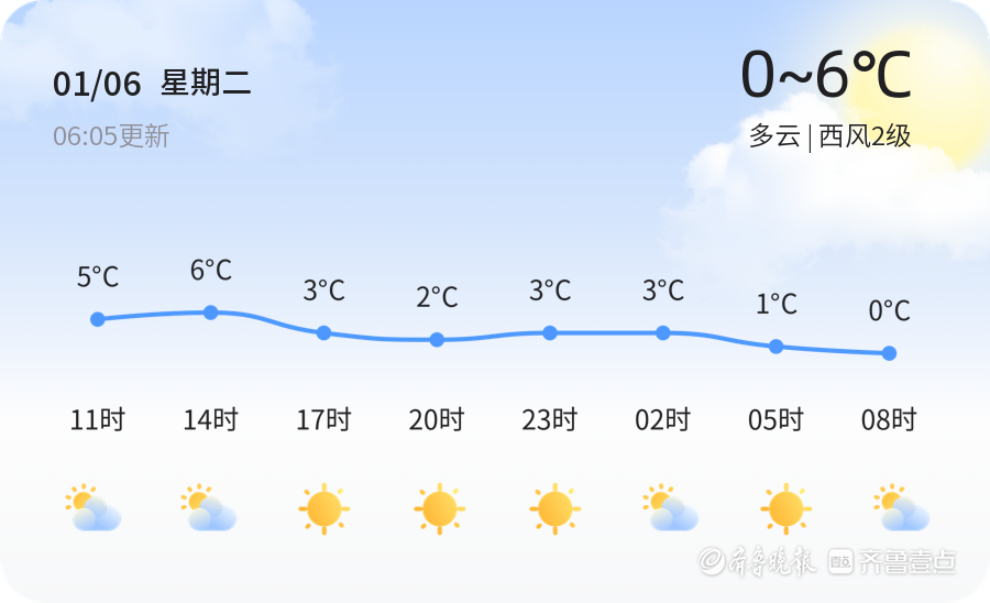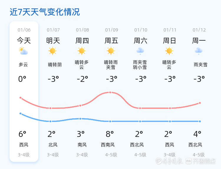 今天是1月6日,星期二,农历十一月十八。威海市今日天气多云,气温在0℃到6℃之间,西风2级,空气湿度为48%,PM2.5指数为36,空气质量良好。各区天气情况基本一致,市民出行请注意保暖。nn明日天气将迎来变化,预计为晴转阴,气温下降,低温将至-3℃,高温仅为2℃,北风3-4级。与今日相比,明日气温明显下降,市民需做好防寒准备,特别是早晨和傍晚时段,温差较大。nn未来三天,威海市天气趋势多变。7日为晴转阴,8日为晴转多云,9日则可能出现雨夹雪天气。气温方面,最高气温在3℃到6℃之间波动,最低气温在-3℃左右。其中,9日的雨夹雪天气可能对市民出行造成影响,建议携带雨具,注意行车安全。nn温馨提示