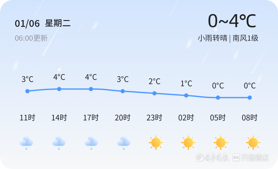 今日是2026年1月6日,农历十一月十八,星期二。青岛市迎来小雨转晴的天气,气温介于0℃至4℃之间。全市各区天气总体平稳,市民可正常出行。目前空气质量良好,PM2.5指数为58,空气湿度为69%。当前时间为6时0分,气温为0.8℃,风力较小,为南风1级。