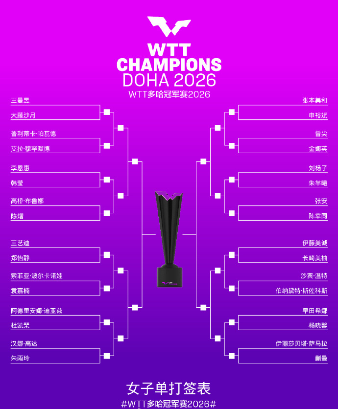 2026年WTT多哈冠军赛将于1月7日至11日在卡塔尔多哈卢赛尔体育馆举行男、女单打签表公布林诗栋、王曼昱等将出战🏓🏓🏓女子单打签表⬇️男子单打签表⬇️(央视新闻)