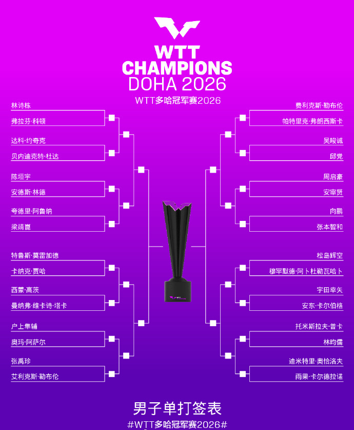 WTT多哈冠军赛2026男、女单打签表公布,林诗栋、王曼昱等将出战央视新闻 2026-01-06 06:43:182026年WTT多哈冠军赛将于1月7日至11日在卡塔尔多哈卢赛尔体育馆举行男、女单打签表公布林诗栋、王曼昱等将出战🏓🏓🏓女子单打签表⬇️ 男子单打签表⬇️ (央视新闻)责任编辑:周小涵