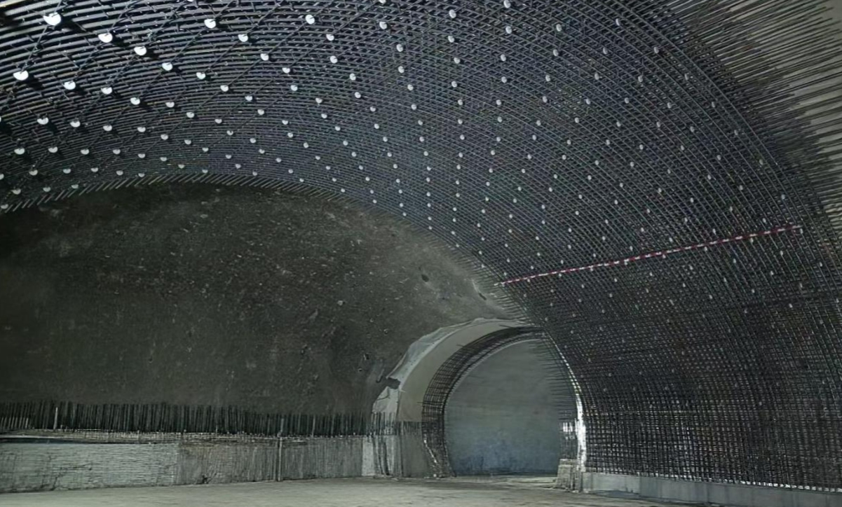 车站内拱墙之上,成排的钢筋纵横交错,像是给隧道撑起了一副黑色的骨架。而那些拳头大小的白色混凝土垫块,正嵌在钢筋的缝隙里——它们本该是毫不起眼的“配角”,隔开钢筋与模板、保证混凝土保护层厚度,是建筑规范里最普通的存在。可当数百个垫块沿着拱顶的弧度铺陈开,灯光扫过的瞬间,竟真的有了“星子垂落”的错觉,深灰的岩壁是夜幕,银黑的钢筋是星河的轨道,而那点点莹白,就是被镶嵌在钢筋骨架里的满天星。