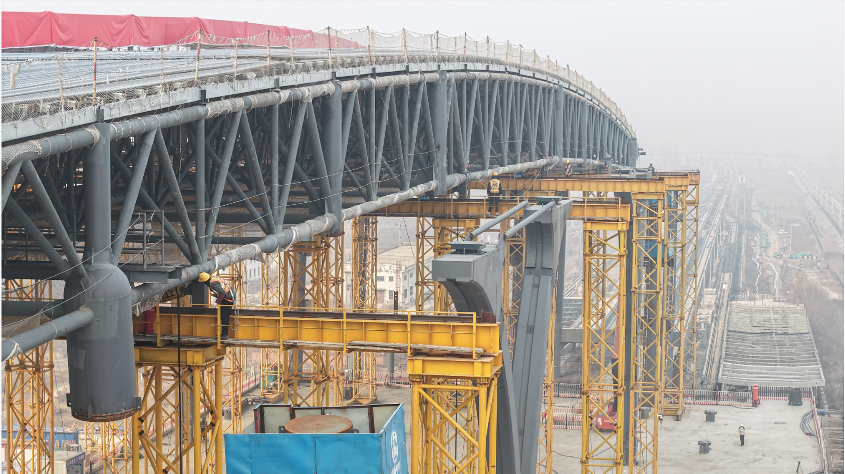 本次实施的最终滑移单元,包含3榀钢桁架及附着的金属屋面系统,总重达1400吨,跨度达195米。由于滑移单元重量大、跨度长,且需上跨下方正常运营、密布27.5千伏高压接触网的德大铁路,项目创新采用“地面拼装、整体累积滑移”工艺,其核心在于将复杂的高空、高风险作业转化为安全的地面作业。
