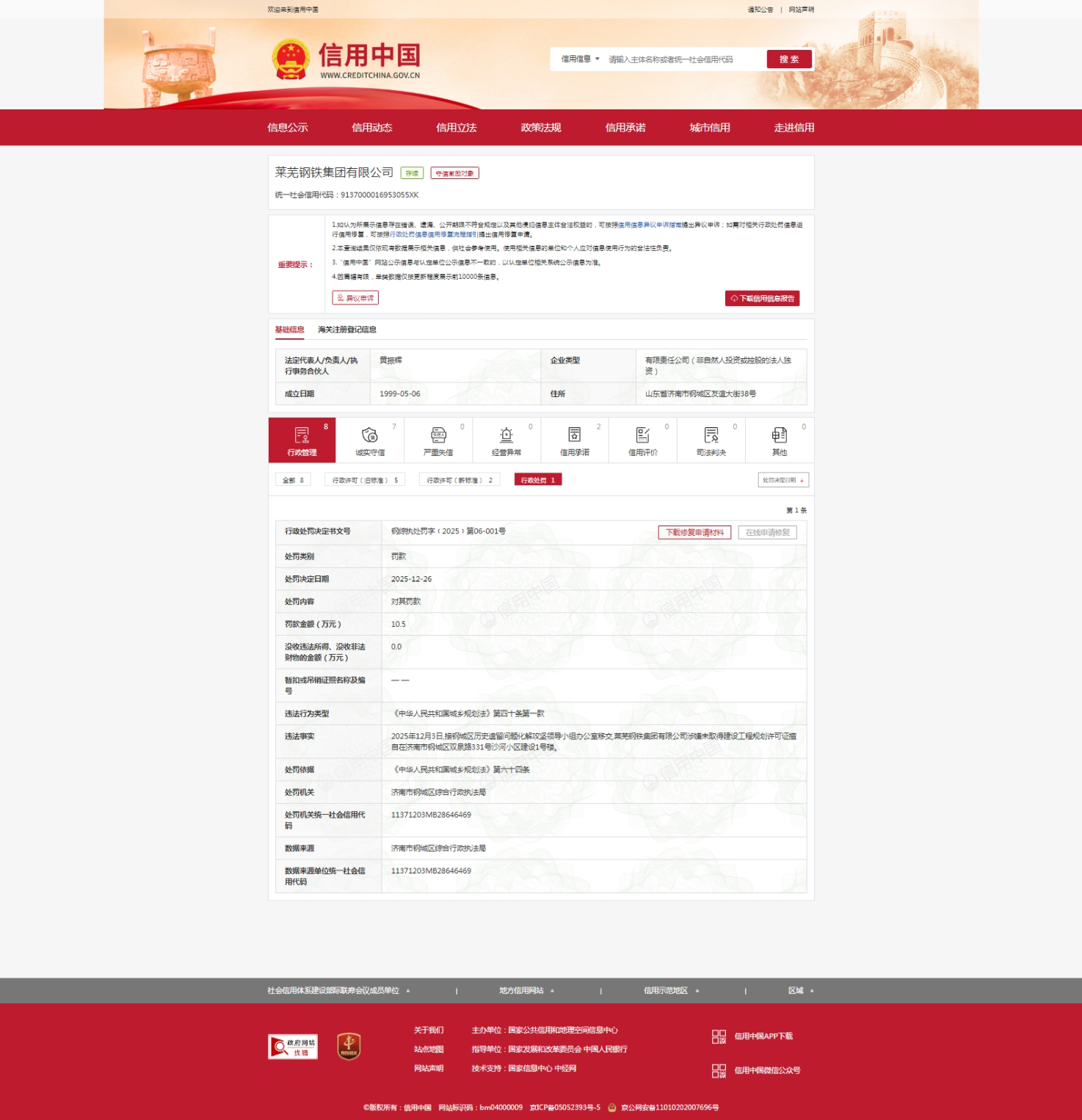 齐鲁晚报·齐鲁壹点记者于信用中国行政处罚栏获悉,2025年12月26日,莱芜钢铁集团有限公司(下称“莱钢集团”)收到10.5万元罚单,处罚机关为济南市钢城区综合行政执法局。