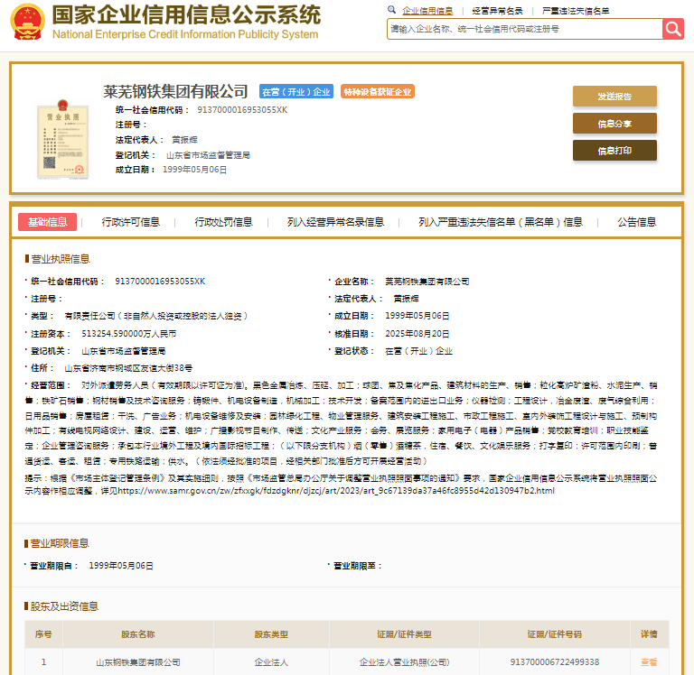 国家企业信用信息公示系统显示,莱芜钢铁集团有限公司成立于1999年,注册资本513254.59万元人民币,法定代表人黄振辉,由山东钢铁集团有限公司全资持股。