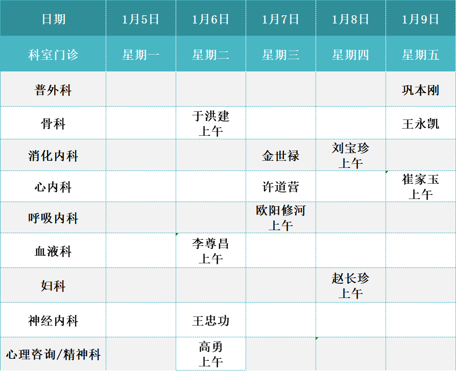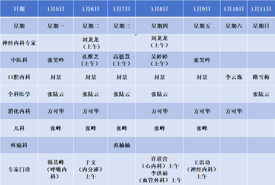 滨州市人民医院1月5日-1月11日门诊医生值班表