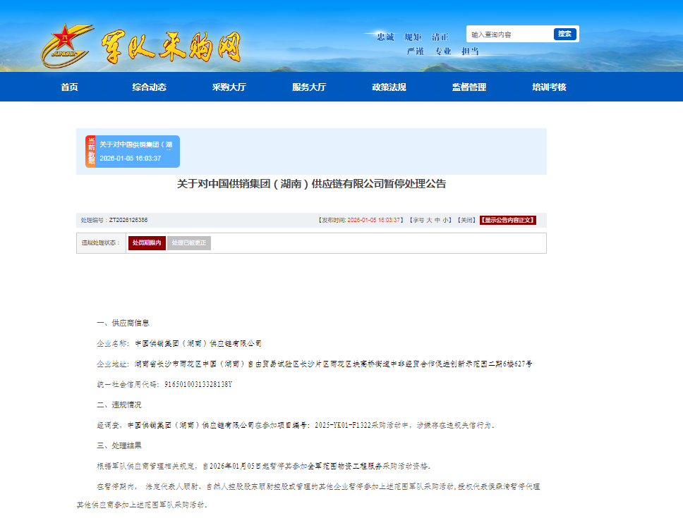 齐鲁晚报·齐鲁壹点记者于军队采购网了解到,1月5日,中国供销集团(湖南)供应链有限公司(下称“中国供销集团湖南供应链公司”)上榜军队采购暂停名单,处理部门为国防科技大学采购管理部门。
