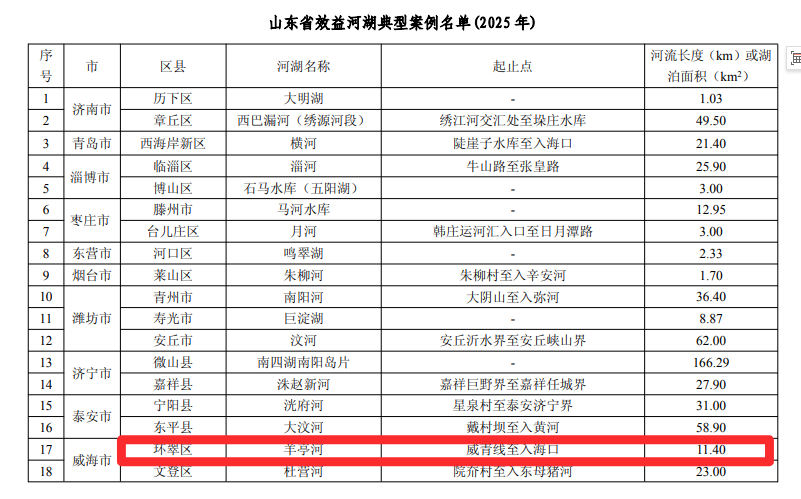 为深入践行绿水青山就是金山银山理念,进一步推动效益河湖建设提质增效,近日,山东省河长制办公室发布了2025年度省级效益河湖典型案例名单,环翠区羊亭河成功入选,其创新经验做法被全省推广。