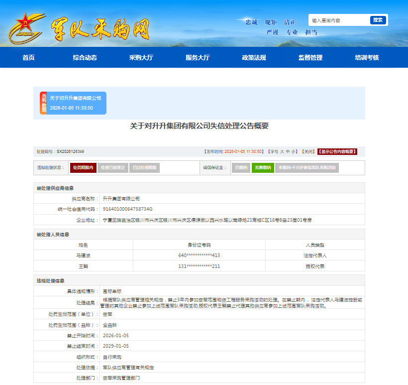 因围标串标,升升集团上榜军队采购失信名单
