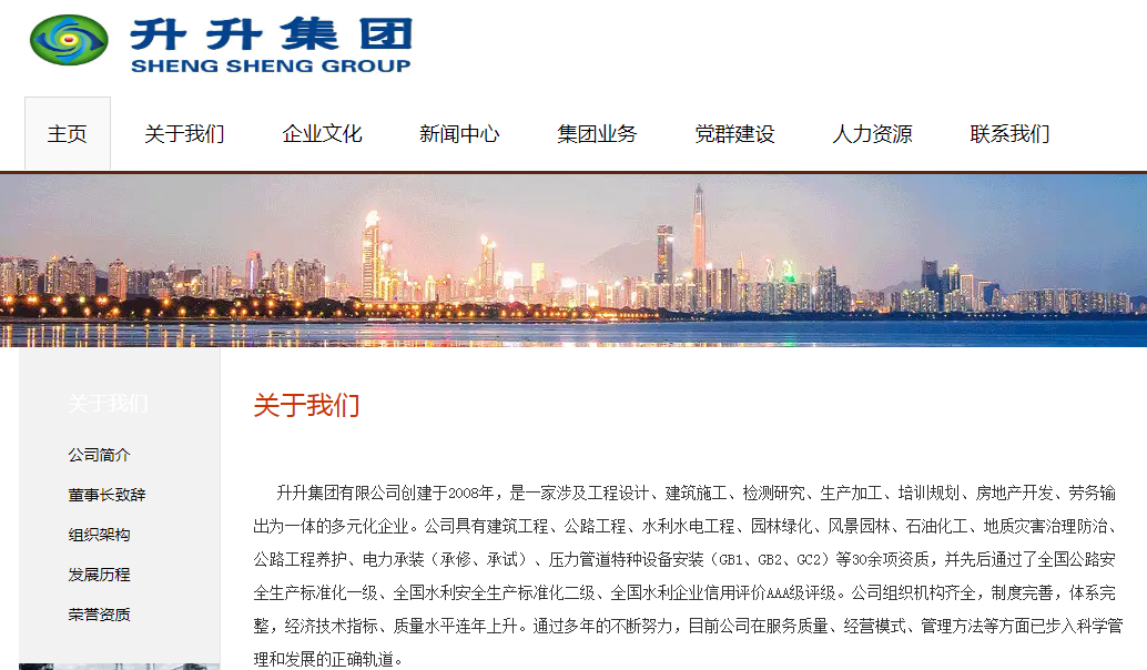 据升升集团官网介绍,公司是一家涉及建筑施工、职业培训规划、油气开发为一体的多元化企业。公司具有建筑、公路、水利水电、市政等40余项资质,并先后通过了全国公路安全生产标准化一级、全国水利安全生产标准化二级、全国水利企业信用评价AAA级评级。