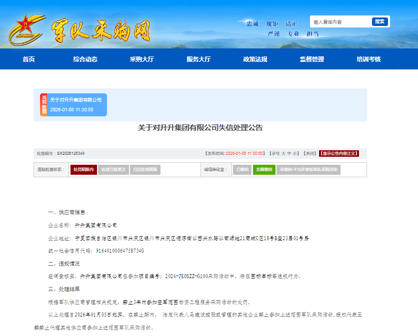 处理部门根据军队供应商管理相关规定,作出禁止其在3年内参加空军范围物资工程服务采购活动的处罚。以上处理自2026年1月5日起算。