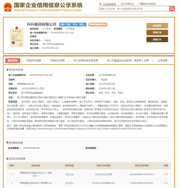 国家企业信用信息公示系统显示,升升集团有限公司成立于2013年,法定发表人马建波,注册资本12050万元人民币,大股东为宁夏诚捷祥园林绿化工程有限公司。