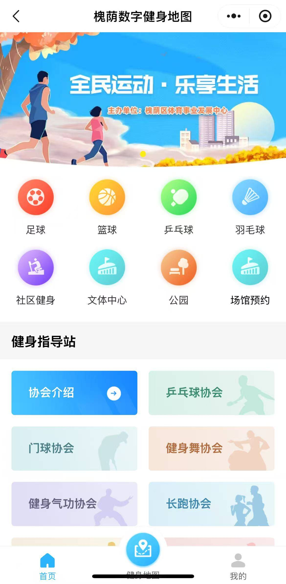 据了解,该程序以“数字健身服务”为核心,整合了场地查询、智能导航、指导站对接三大基础功能。同时,对接了公共体育场馆,为市民提供预约服务;链接了乒乓球、健身舞、太极拳、长跑、空竹、门球、健身气功7类体育协会、160个指导站,提供了“线下公益教学+线上课程推荐”的全方位指导;还会发布社区篮球赛、乡村运动会等赛事报名信息,方便群众参与运动健身。