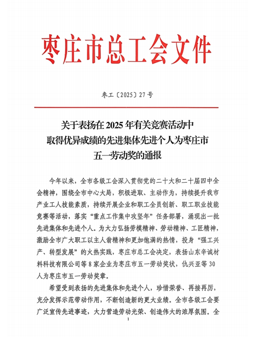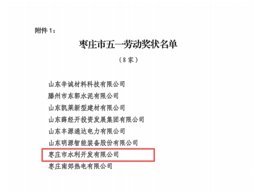 近日,枣庄市总工会发布2025年度五一劳动奖表彰通报,枣庄市水利开发有限公司与公司党支部书记、总经理岳磊双双上榜,分别荣膺“枣庄市五一劳动奖状”与“枣庄市五一劳动奖章”。这一“双奖”佳绩,不仅是对个人领导力的高度认可,更是对公司全员创新体系与高质量发展成果的集中褒奖。