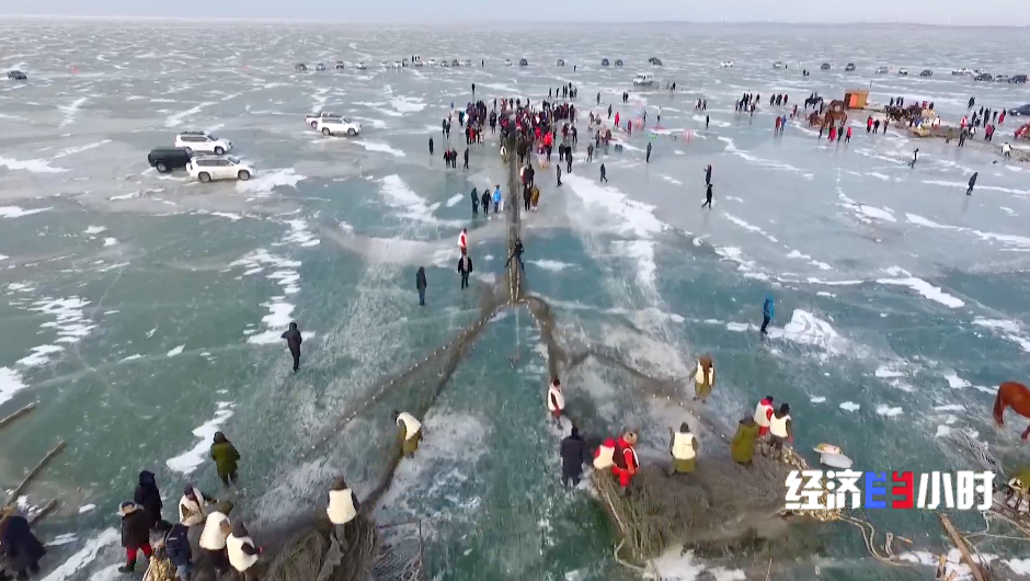 为了吸引游客,查干湖还推出私人订制捕鱼、冰下盲盒等新项目。100米长的挂网,游客组队拉拽,亲手捕鱼后,可以直接送进后厨做成铁锅炖。