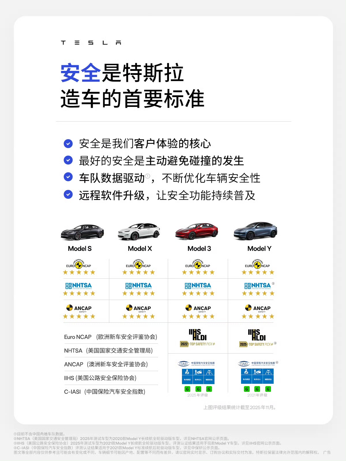 2025年,现款Model Y 斩获2025年Euro NCAP(欧洲新车安全评鉴协会)、ANCAP(澳洲新车安全评鉴协会)“五星安全”评级。作为全球车型,S3XY全系车型满足全球多个市场的严苛标准,已在美国NHTSA、欧洲Euro NCAP、中国C-IASI、澳大利亚ANCAP等多个权威机构中获得“五星安全”评级。