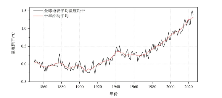 图1 1850~2025年全球地表平均温度距平序列(相对1850-1900年平均值)