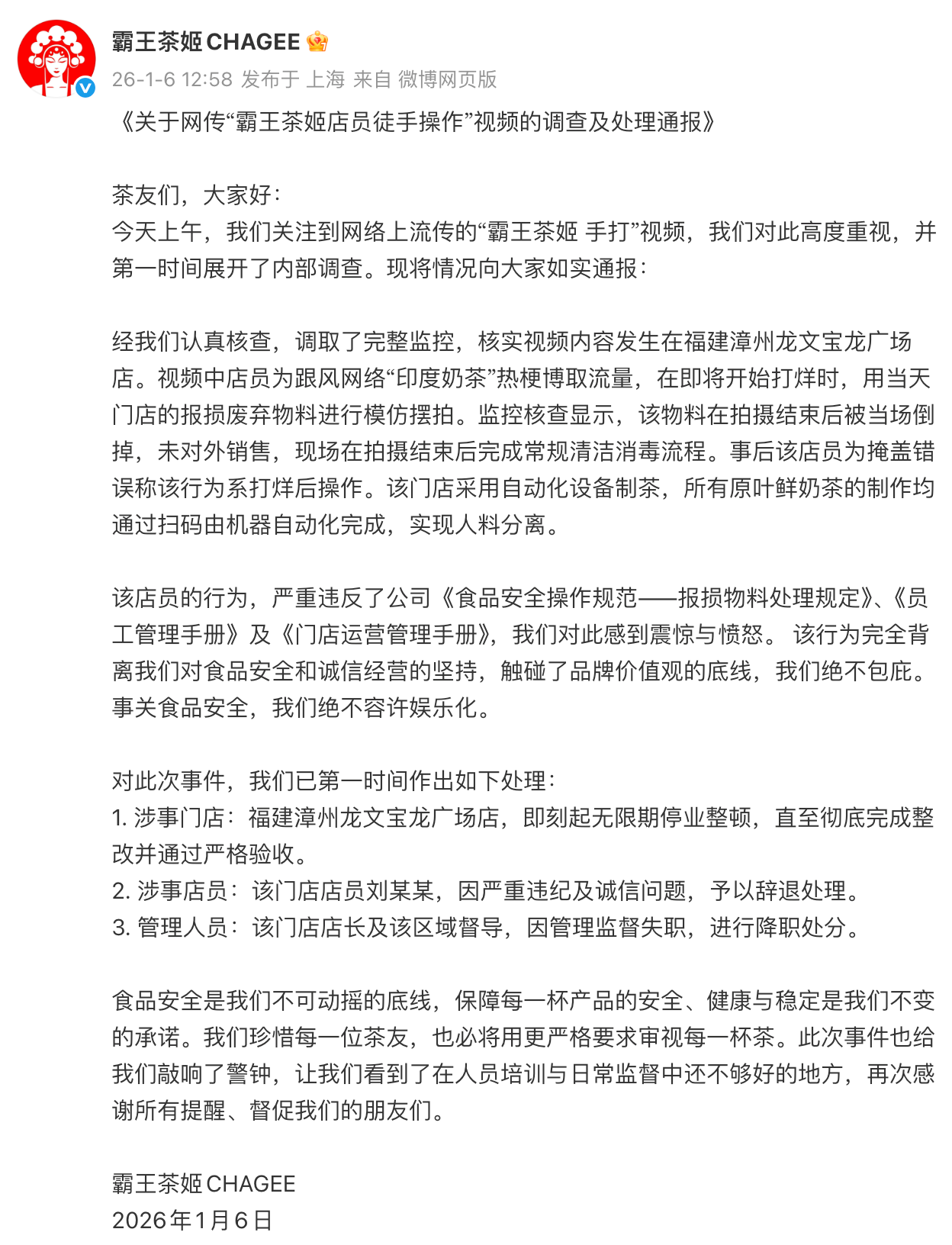 1月6号中午,霸王茶姬发布官方通报: