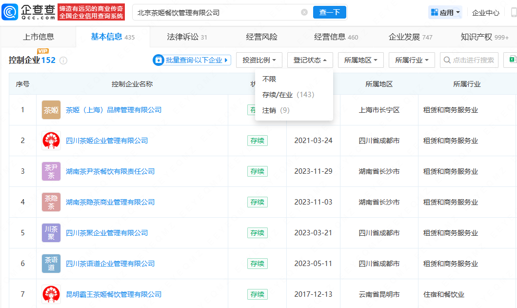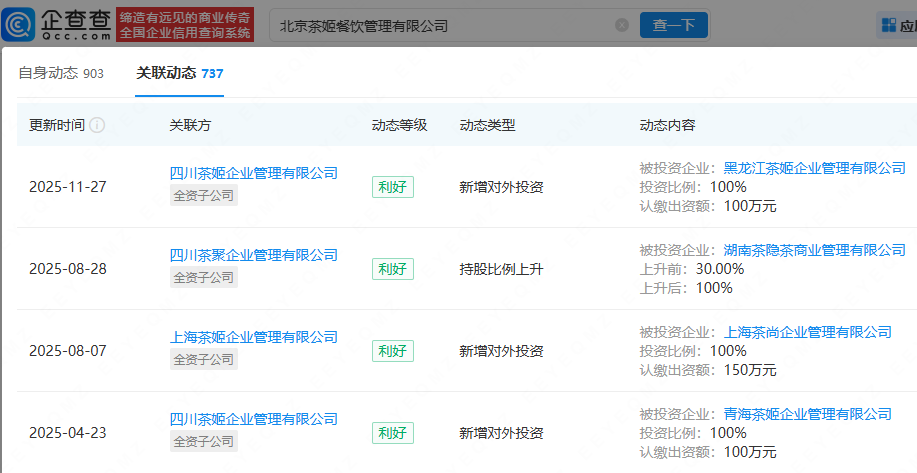 企查查APP显示,霸王茶姬关联公司北京茶姬餐饮管理有限公司成立于2020年12月,注册资本约3799.97万元,由CHAGEE INVESTMENT PTE.LTD.全资持股。企查查信息显示,该公司控制企业超百家,值得一提的是,2025年以来,该公司已成立多家新公司,包括黑龙江茶姬企业管理有限公司、青海茶姬企业管理有限公司、内蒙古茶姬企业管理有限公司等。此前,霸王茶姬公布了2025年第三季度财报。财报显示,截至2025年9月30日的第三季度,霸王茶姬全球门店数达到7338家。