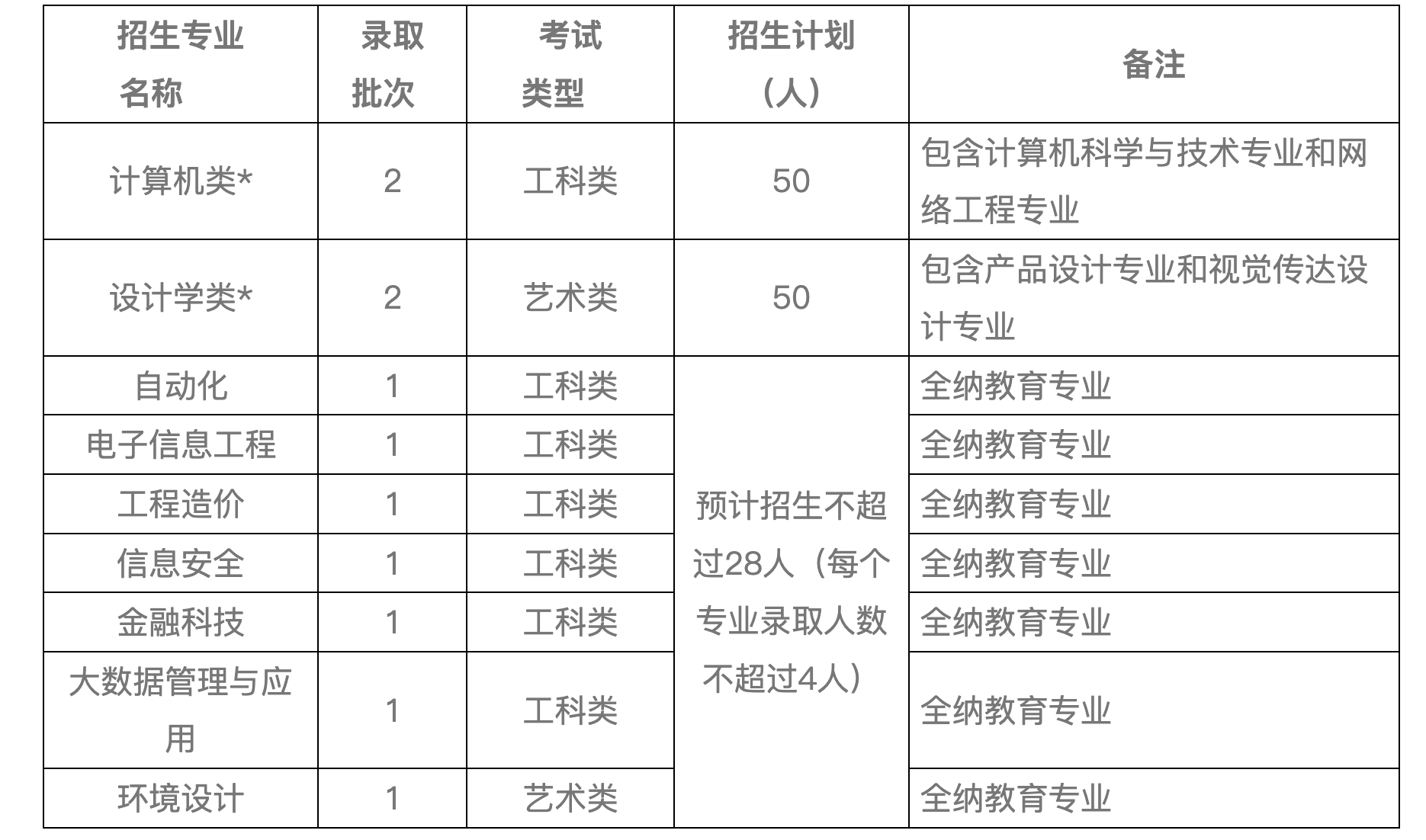 1.工科类和艺术类考生按录取批次分类录取,录取顺序为:第1批次、第2批次,即先录取第1批次(全纳教育专业),再录取第2批次(按大类招生专业)。